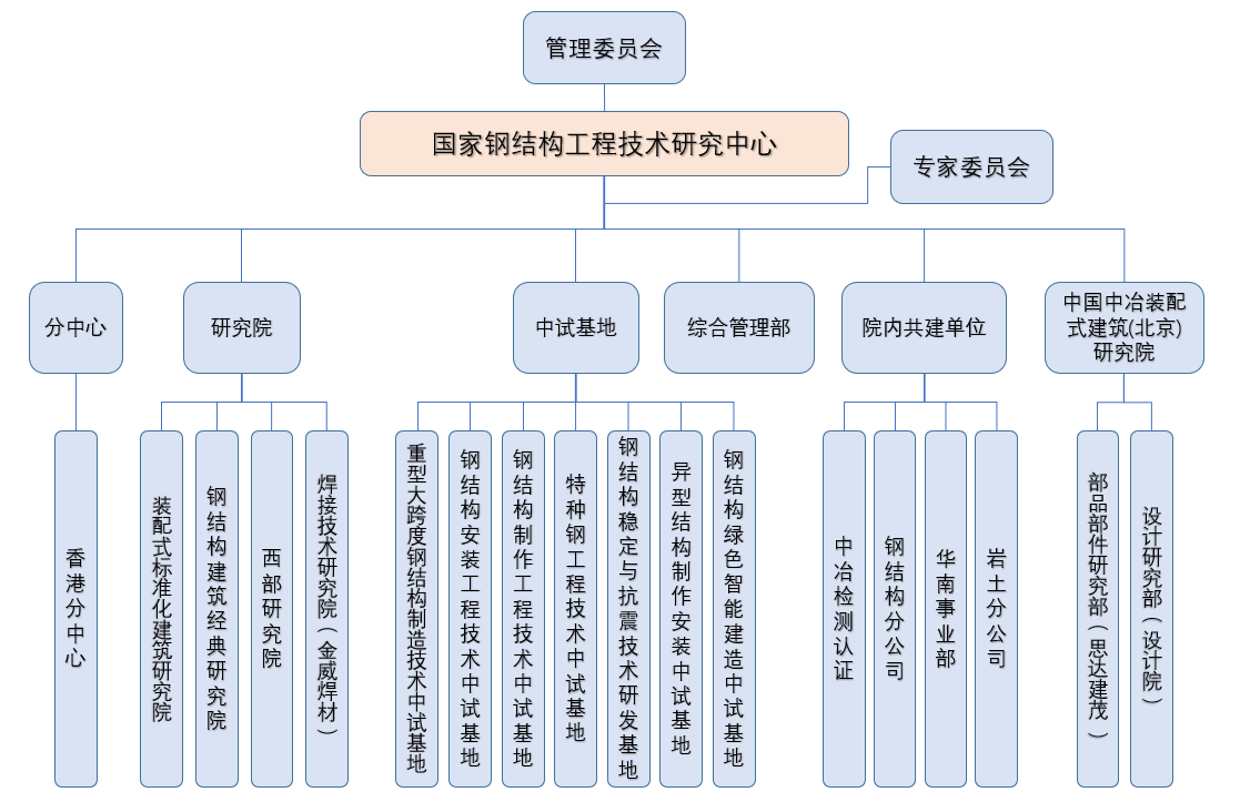 鋼結構中心的組織機構主要包括1個實體管理部門,1個分中心,4個研究院,7個中試基地,4家院內共建單位,1個中國中冶研究院。這些分中心、研究院、中試基地的建成使鋼結構中心與本領域的知名企業、學校、研究機構建立了緊密長期的合作關系,在鋼結構工程技術領域的研發、中試及生產任務中發揮著重要作用,有力地推動了新技術、新產品的產業化進程。