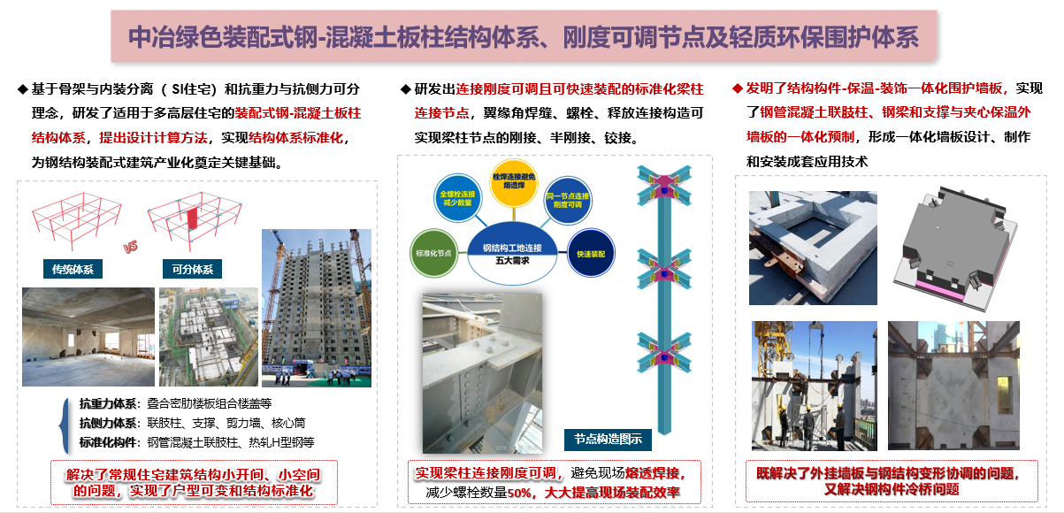 (3)中冶綠色鋼結構裝配式建筑關鍵技術:創新研發出適用于多高層住宅的裝配式鋼-混凝土板柱結構體系,開發了與鋼結構裝配式建筑配套的一體化輕質節能圍護墻板產品,提出了中冶綠色鋼結構裝配式建筑產業化成套技術、裝備、工藝和標準體系,實現了規模化應用。